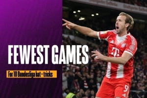 据Opta统计,凯恩出战76场德甲比赛,10次上演帽子戏法,他是德甲历史10次戴帽所用场次最少的球员,只有4名球员德甲戴帽次数更多,他们是盖德·穆勒、莱万、马里奥·戈麦斯和克劳斯·费舍尔。