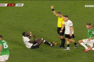 吕迪格被对手撞倒在地,但被吹罚为阻挡犯规,下轮德国主场对阵卢森堡时将累计黄牌停赛。
