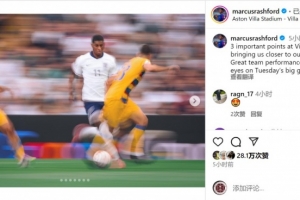 拉什福德社媒晒出比赛照片,配文:“在维拉公园球场拿下重要三分,让我们更接近目标!球队表现出色,现在专注于周二的重要比赛(客战塞尔维亚)!”