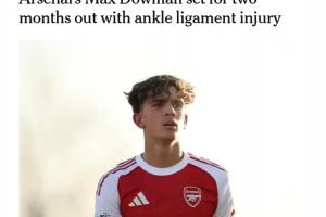 阿森纳中场球员马克斯・道曼因踝关节韧带损伤,预计将缺阵约两个月。