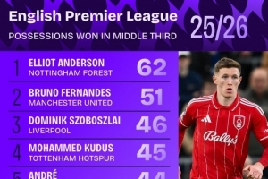体育资讯12月11日讯 Squawka统计了本赛季球员在英超中场区域(中场三区)夺得球权的次数,并列出榜单,安德森62次居首,B费、索博斯洛伊排名二三位。