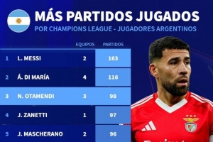 体育资讯12月12日讯 德国转会市场统计了阿根廷球员的欧冠出场次数,并列出榜单,梅西、迪马利亚前两名,奥塔门迪升至第三位。
