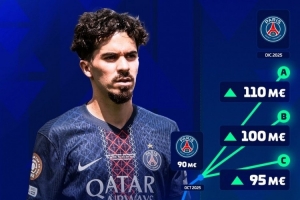 体育资讯12月12日讯 德国转会市场预热巴黎中场维蒂尼亚的身价变化,他的最新身价最高可能达到1.1亿欧元。