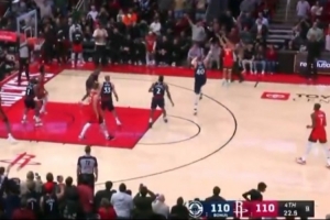 本场比赛,火箭球员谢泼德替补出战26分钟,9中4,三分5中2拿到10分4篮板2助攻1盖帽,正负值+6。最后时刻比分110平时,谢泼德右侧大空位三分不中。