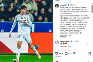 体育资讯12月15日讯 皇马小将巴尔德佩尼亚斯今天更新Instagram,谈到自己的西甲首秀。