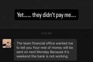 帕斯卡尔晒出两张图片和一段视频,第一张图片中的文字为“球队希望我告诉你,你的剩余薪水会在下周一支付,因为现在是周末,银行不上班。”“然而,他们没有付我钱。”帕斯卡尔在图片中写道。