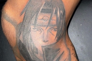 而在他的右腿膝盖内侧的位置,还有一个宇智波鼬的头像纹身。