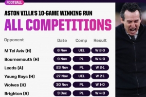 在球队作为顶级联赛俱乐部的111年时间里,维拉首次取得正式比赛10连胜。而且,这也是他们自1990年以来,首次在顶级联赛中取得7连胜。