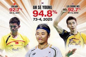 体育资讯12月23日讯 世界羽联官方消息,韩国选手安洗莹以94.8%的胜率创造单打项目单赛季最高胜率,打破林丹和李宗伟的纪录。