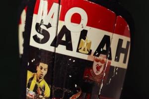 板上印有他在埃及国家队穿10号球衣的图案,以及利物浦主场通道里“这里是安菲尔德”的著名logo。