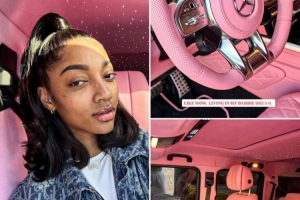 从照片可以看到,车内装饰全是芭比粉配色,还带有豪华星空顶。