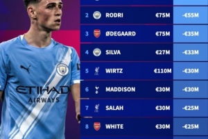 1、福登(曼城,8000万欧):-6000万欧