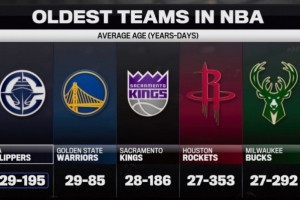 转播方晒出一组数据,本赛季联盟最老的5支球队平均年龄如下:
