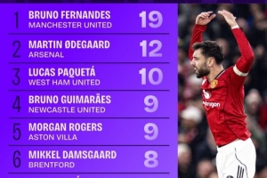 体育资讯1月1日讯 数据网站Squawka盘点了2025年英超联赛球员直塞球次数排行,曼联中场B费19次直塞,大幅领先排名榜首,阿森纳中场厄德高12次第二。