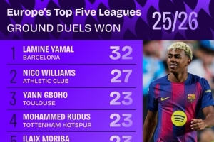 本赛季五大联赛地面对抗成功排名: