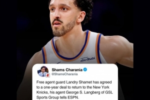 体育资讯9月12日讯 据名记Shams报道,自由球员后卫兰德里-沙梅特已同意以一份一年合同重返纽约尼克斯。