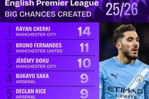 体育资讯1月10日讯 数据机构squawka统计了本赛季英超创造重大机会情况,谢尔基力压B费居首。