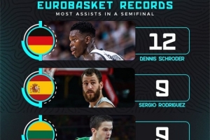 根据数据统计,施罗德此役送出12次助攻,这是欧锦赛半决赛历史纪录。此前的纪录保持者是西班牙球员塞尔吉奥-罗德里格斯和立陶宛球员曼塔斯-卡尼提斯,两人都曾在欧锦赛半决赛上送出9次助攻。