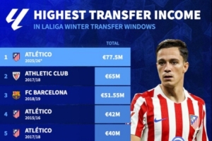 体育资讯1月16日讯 随着出售拉斯帕多里和加拉格尔,根据德转数据,马竞以7750万欧成西甲历史上冬窗收入最高的球队。