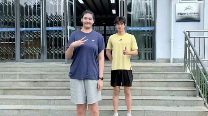 体育资讯9月14日讯 近期,中国游泳队和中国女篮在昆明海埂基地集训时,潘展乐(1米92)和张子宇(2米26)同框上演最萌身高差。