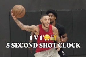 训练师晒骑士后卫朗佐-鲍尔、开拓者后卫斯库特-亨德森,以及另一位职业球员Milan Acquaah的单挑训练视频,进攻时间限时5秒。