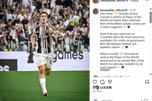 伊尔迪兹在社媒也晒出庆祝进球照片,配文写道:“这是多棒的一个月!很荣幸当选意甲8月最佳球员以及国家德比最佳,很感激大家对我的支持!”