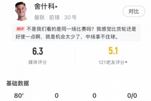 体育资讯9月15日讯 英超曼市德比,曼联前锋舍什科首发出战,球员本场数据如下: