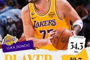 湖人官方发布东契奇周最佳海报:东契奇本赛季第二次荣膺NBA西部周最佳球员。
