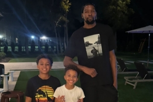 照片中杜兰特和奥古斯汀的两个儿子合影留念。KD和奥古斯汀是得州大学的前队友,而后者在休斯敦有房产,这张照片就可能是拍于奥古斯汀休斯敦的家中。
