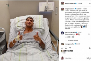 帕拉西奥斯社媒晒出自己躺在病床上竖起大拇指的照片,并写道:“我想通知大家,上周末我不幸受伤,这将让我缺席今年剩余的比赛。”