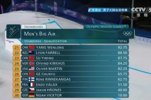 冬奥单板滑雪男子大跳台预赛:苏翊鸣第4晋级!葛春宇 杨文龙出局