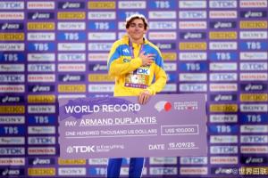 杜普兰蒂斯成为2025年东京田径世锦赛第一个带着“世界纪录”号码牌上台领奖的选手,也获得了10万美元的世界纪录奖金。