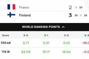 体育资讯9月16日讯 2025年男排世锦赛第一阶段小组赛C组第二轮,芬兰男排苦战五局3-2(25-19 17-25 29-27 21-25 15-9)爆冷战胜两届奥运冠军法国男排。