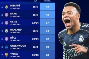 1. 姆巴佩(皇马),31场,38球+5助攻=43球