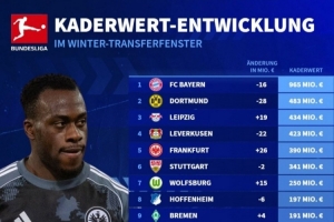 体育资讯2月11日讯 德国转会市场列出了德甲球队冬窗之后的身价排名,拜仁9.65亿欧居首,多特4.83亿欧次席。