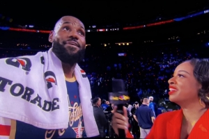 体育资讯2月16日讯 NBA全明星正赛循环赛,美国星条队42-40险胜美国新星队,詹姆斯赛后在场边接受了媒体采访。