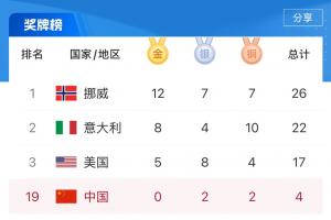 体育资讯02月16日讯 米兰冬奥会第9个比赛日战罢,中国队仍2银2铜,排在第19。挪威12金7银7铜高居第一,意大利8金4银10铜第二,美国5金8银4铜第三。