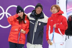 赛后佐藤康弘激动地与两人庆祝,苏翊鸣和深田茉莉则将金牌挂在了教练身上。