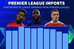 以下为近10年英超俱乐部从其他联赛引援比例情况: