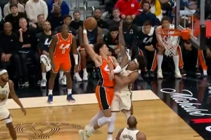 想得太简单!阿门篮下捡板想直接扣被巴洛大帽按下