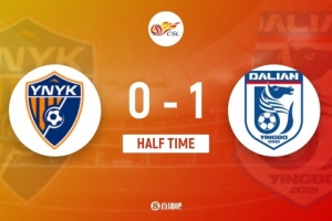 伤停补时3分钟。上半场比赛结束,云南玉昆0-1大连英博。