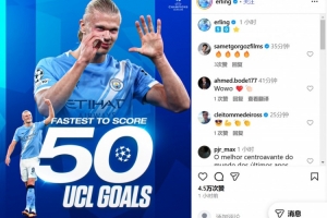 在社交媒体上,哈兰德晒出了自己最快达成欧冠50球的海报,显然这样的成就令曼城射手非常自豪。