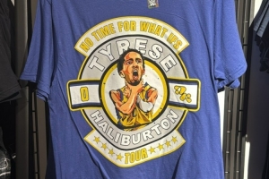 哈利伯顿晒出一张印有自己锁喉漫画照的WWE(世界摔角娱乐)周边T恤,并@了WWE。