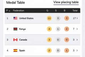 最新的世锦赛奖牌榜,美国11金3银3铜继续高居榜首,肯尼亚4金1银2铜第二。中国在女子链球(赵杰和张家乐)项目斩获1银1铜、在男子跳远(石雨豪)项目斩获铜牌、在男子20公里竞走斩获银牌,2银2铜4块奖牌排第19。巴林1银1铜、韩国1银、东道主日本2铜、卡塔尔1铜上榜。