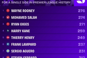 体育资讯9月21日讯 Squawka统计了球员在单一球队参与英超进球的数量,并列出榜单,萨拉赫参与274球排名第二位,距离首位鲁尼仅差2球。