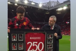 此役是马奎尔为曼联出战的第250场比赛,B费社媒晒出马奎尔领取纪念球衣的视频,配文:“重大成就,当之无愧,大个子。”