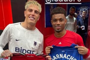 在比赛结束后,加纳乔与阿玛德进行了深入交流,也和B费进行了简短的问候。之后阿玛德又将自己和加纳乔互换球衣的合照发到了社媒上,@的账号是两人一同所属的经纪公司。