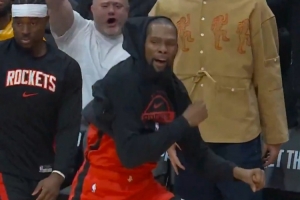 你够不着!杜兰特弧顶三分潇洒命中 帮助火箭拉开比分