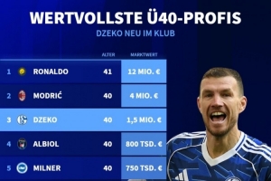 体育资讯3月17日讯 德转列现役年龄40岁及以上的球员身价排行,C罗1200万欧居首,莫德里奇400万欧第二,今天年满40岁的哲科150万欧第三。