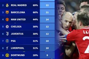 体育资讯03月19日讯 欧冠八强已经全部产生,德转统计了各球队自1994/95赛季起参加欧冠1/4决赛的次数,其中,拜仁、皇马、巴萨位居前三,曼联第四。